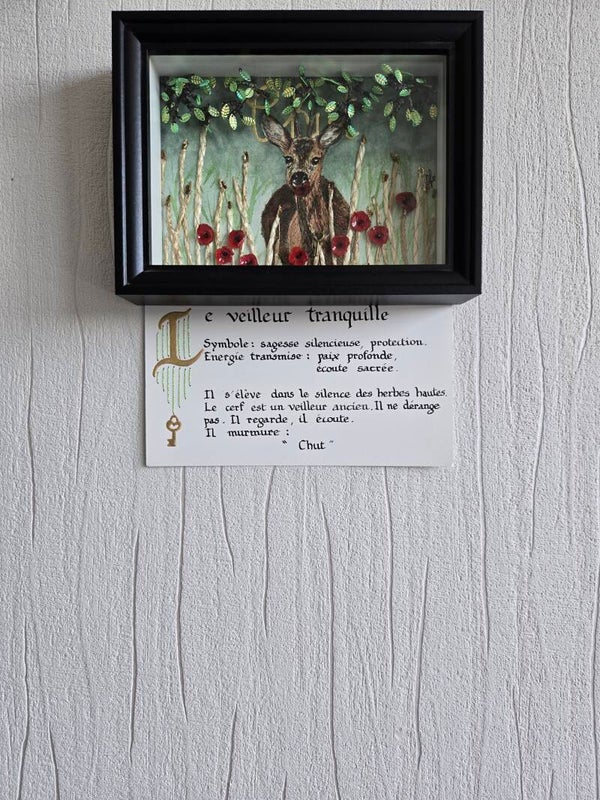 Cette création rend hommage au cerf, symbole de force douce et de veille silencieuse.